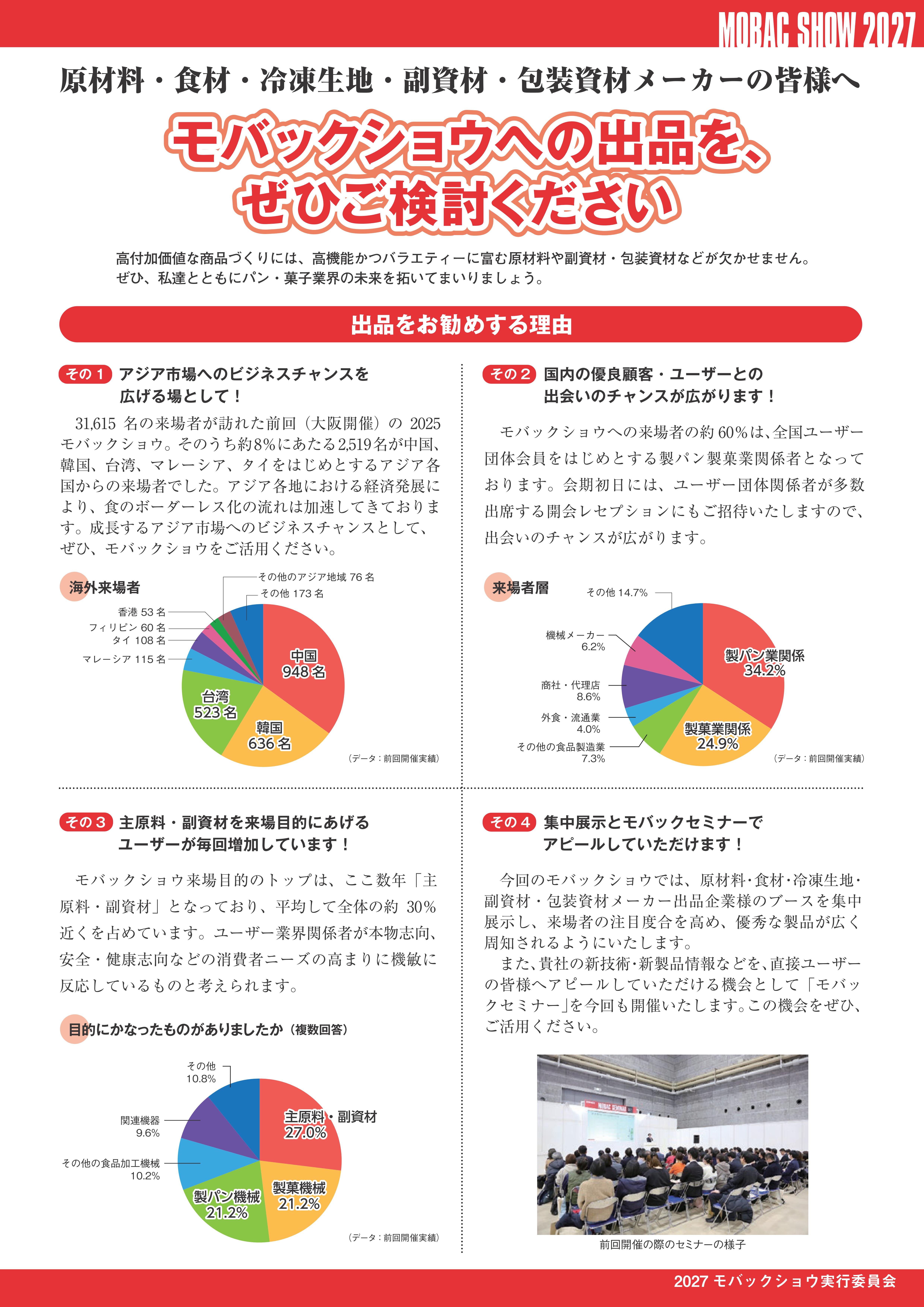今回のモバックショウでは、原材料・食材・冷凍生地・副資材・包装資材メーカー出品企業様のブースを集中展示し、来場者の注目度合を高め、優秀な製品が広く周知されるようにいたします。 また、貴社の新技術・新製品情報などを、直接ユーザーの皆様へアピールしていただける機会として「モバックセミナー」を今回も開催いたします。この機会をぜひ、ご活用ください。