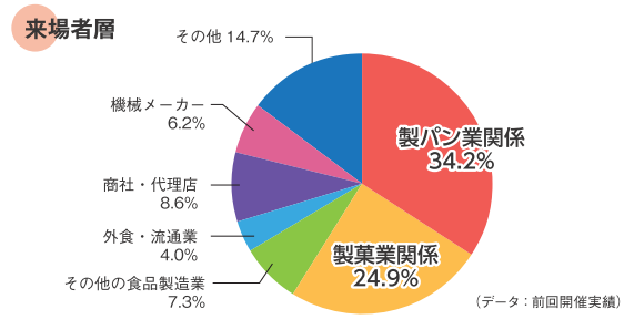 モバックショウへの来場者の約 60%は、全国ユーザー団体会員をはじめとする製パン製菓業関係者となっております。会期初日には、ユーザー団体関係者が多数出席する開会レセプションにもご招待いたしますので、出会いのチャンスが広がります。