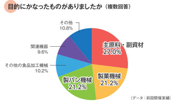 モバックショウ来場目的のトップは、ここ数年「主原料・副資材」となっており、平均して全体の約 30%近くを占めています。ユーザー業界関係者が本物志向、安全・健康志向などの消費者ニーズの高まりに機敏に反応しているものと考えられます。