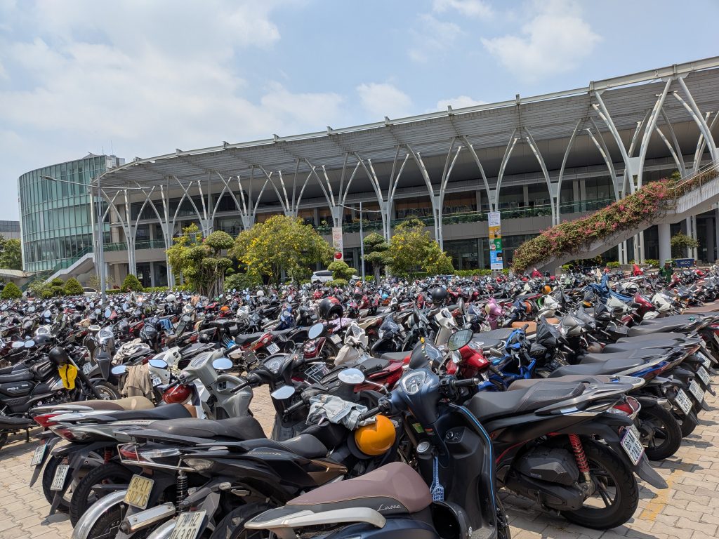 4月でしたが、ベトナムは暑く、半袖で過ごせるほどの気温でした。ベトナムでは、道路は車も走っていますが、バイクが日本では見られない程、多数見かけました。また、会場のバイク駐車場もいっぱいなるなど、バイクの利用率はかなり高いと感じました。